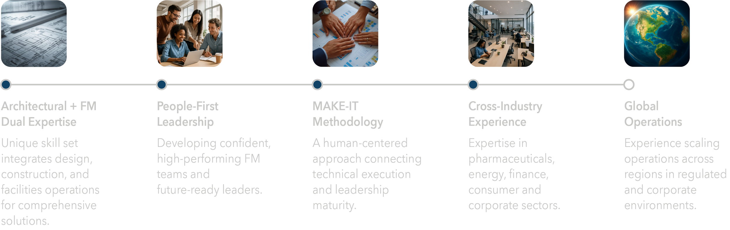 Combining design thinking, operational alignment, and people development, FOM brings clarity, standardization, and future-ready solutions to complex facilities environments. Through the MAKE-IT™ methodology and a systems-thinking approach, we partner with organizations to advance strategic alignment, optimize performance, and achieve enduring operational excellence that supports mission, business value, and long-term sustainability.